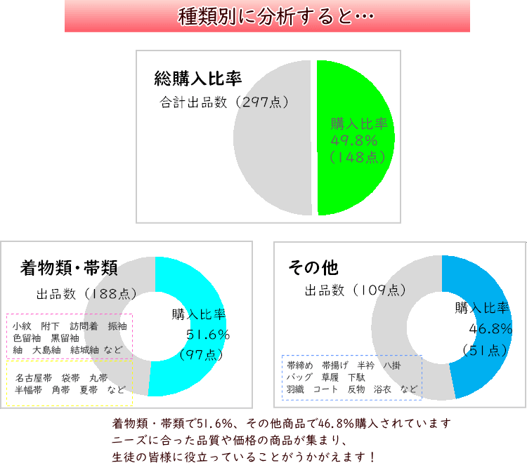 今回、総出品数の約半分、49.8%の着物や帯が、新しい持ち主に変わりました。