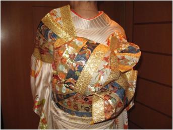 左脇にして後板を入れ一巻き、さらに一巻きして手先を上に一結びし、箱ヒダを作