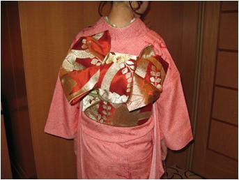 を計り、後板を入れて胴に二巻き、手先で箱ヒダを作り、上に結び、細紐、帯枕、