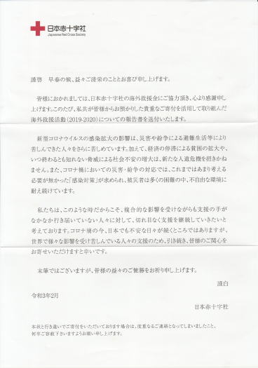 日本赤十字社より寄付を活用して取り組んだ海外救援活動(2019〜2020)についての報告書が送付されました。